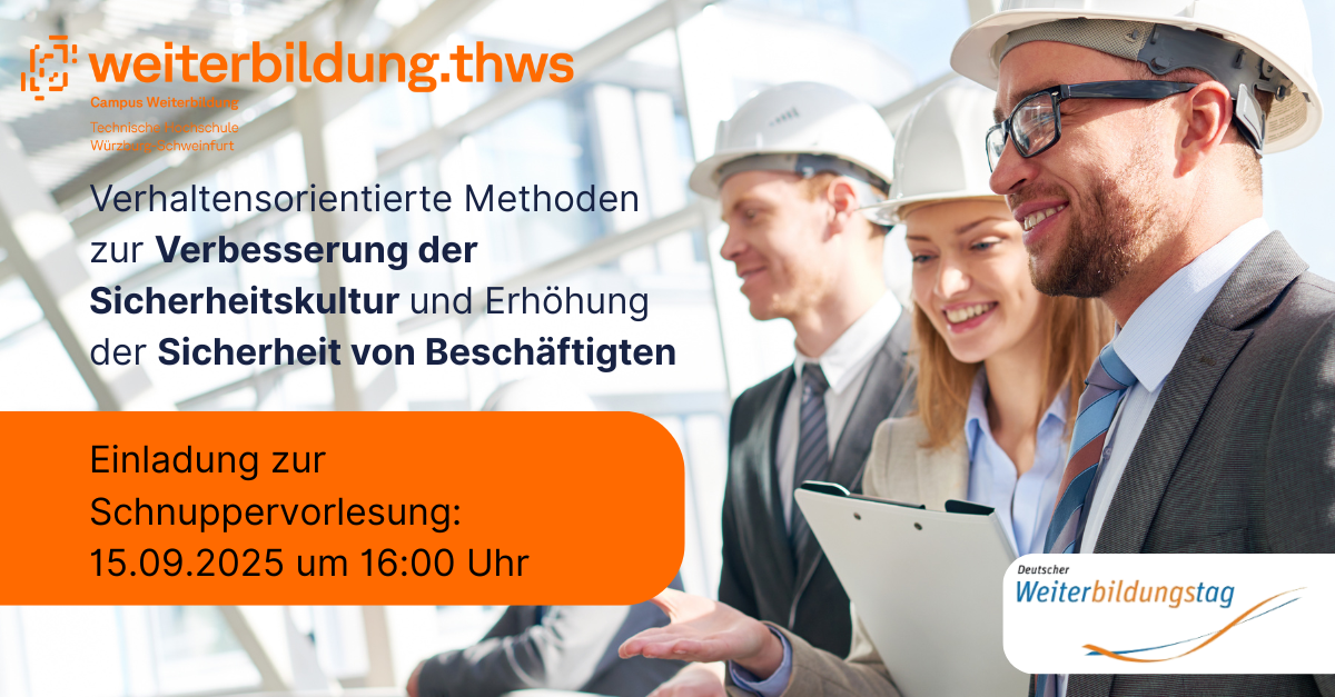 Im Vortrag zeigt Prof. Dr. Christoph Bördlein, wie Behavior-Based Safety (BBS) als verhaltensorientierter Ansatz wirkt – jenseits von Schuldzuweisungen, Moden oder Appellen. Anhand anschaulicher Beispiele wird erklärt, wie sichere Verhaltensweisen identifiziert, beobachtet, gefördert und langfristig verankert werden können. Wer Arbeitssicherheit wirklich verbessern will, braucht mehr als Regeln: Er braucht ein System, das Verhalten nachhaltig verändert. Ideal für alle, die sich für moderne, wirksame und praxisnahe Ansätze in der Arbeitssicherheit interessieren – und mehr über den Zertifikatslehrgang an der THWS erfahren möchten.